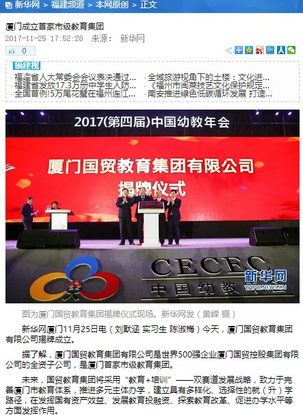11月25日,廈門首家市級教育集團——廈門國(guó)貿教育集團有限公司揭牌成(chéng)立。新華網進(jìn)行了專題報道(dào)。
