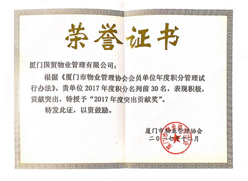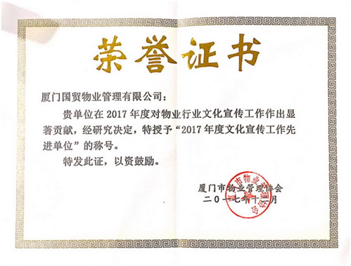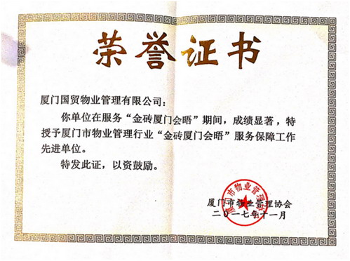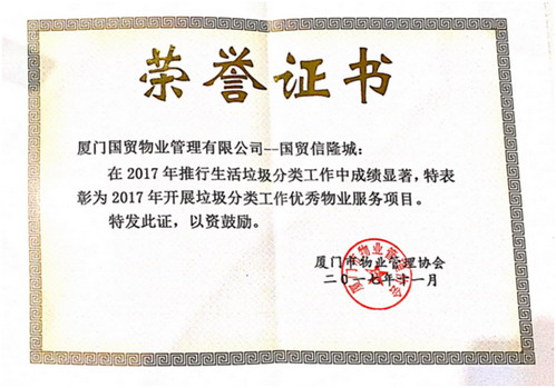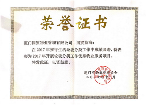 2017年,國(guó)貿物業公司在保障“金磚廈門會(huì)晤”、推行垃圾分類等工作中,攻堅克難、勇于擔當,全力配合開(kāi)展工作,自覺投身廈門“五大發(fā)展”示範市建設中,為“廈門會(huì)晤”的圓滿舉辦和垃圾分類工作的順利開(kāi)展貢獻力量。