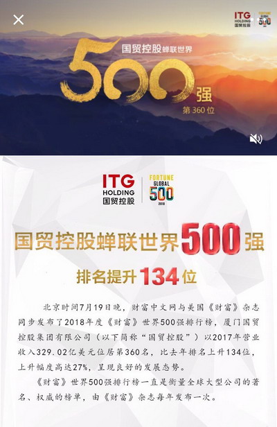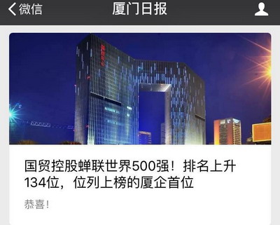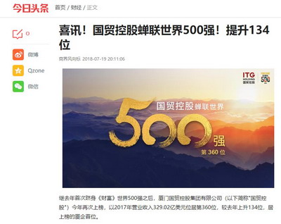 北京時(shí)間7月19日晚,财富中文網與美國(guó)《财富》雜志同步發(fā)布了2018年度《财富》世界500強排行榜。繼去年跻身世界500強之後(hòu),國(guó)貿控股再度登上今年的榜單,以2017年營業收入329.02億美元位居第360位,比去年排名上升134位,位列上榜的廈企首位。