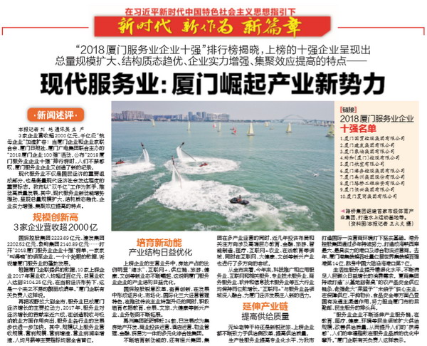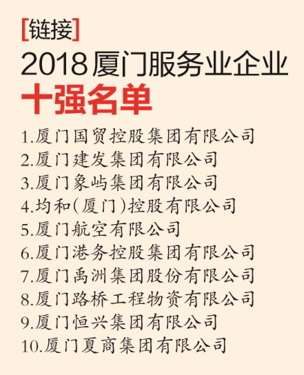 3家企業營收超2000億元,千億級“航母企業”加速擴容!當廈門企業和企業家聯合會(huì)、廈門日報社、廈門廣電集團聯合主辦的“2018廈門企業100強”活動,公布“2018廈門服務業企業十強”排行榜時(shí),人們不禁感歎,廈門服務業企業又創造了新的紀錄。
