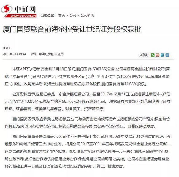 3月13日晚間,國(guó)貿控股旗下上市公司廈門國(guó)貿(600755)發(fā)布公告,公司與前海金融控股有限公司(簡稱“前海金控”)聯合收購世紀證券有限責任公司(簡稱“世紀證券”)91.65%股權項目獲深圳證監局正式核準。收購完成(chéng)後(hòu),前海金控將(jiāng)持有世紀證券47%股權,廈門國(guó)貿持有44.65%股權。
