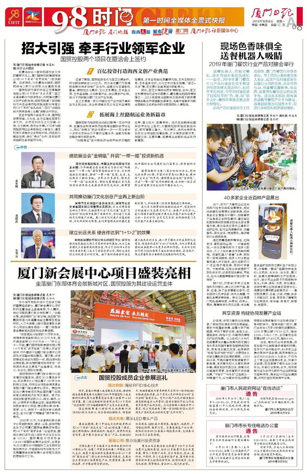 在廈洽會(huì)這(zhè)一服務招商引資工作的重要平台上,廈門國(guó)貿控股集團有限公司(以下簡稱“國(guó)貿控股”)收獲碩果。記者獲悉,今年廈洽會(huì)期間,國(guó)貿控股與2家行業領軍企業喜結良緣——國(guó)貿控股與深圳市至正文博集團有限公司(以下簡稱“至正文博”)簽訂全面(miàn)戰略合作投資協議,共同推動廈門文創産業的發(fā)展;國(guó)貿控股旗下國(guó)貿股份與來自台灣的裕民航運股份有限公司(以下簡稱“裕民航運”)簽訂“絲路沿線大宗商品海上運輸”戰略合作協議。