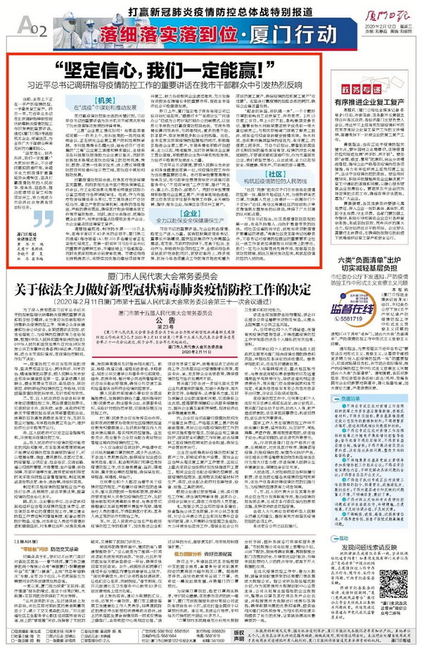 當前,全市上下正在一手嚴抓疫情防控,一手勤抓複工複産。昨日一早,習近平總書記在北京調研指導新型冠狀病毒肺炎疫情防控工作時(shí)發(fā)表的重要講話,通過(guò)《廈門日報》傳遞到(dào)機關企業、街道(dào)社區,為全市廣大幹部群衆帶來無窮的力量和信心。