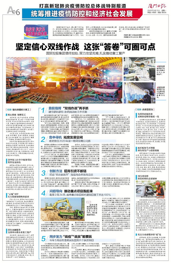 面(miàn)對(duì)疫情防控與複工複産“兩(liǎng)個戰場”,國(guó)貿控股集團堅持黨建引領,強化組織領導,通過(guò)建立群防群控、協同高效的工作機制,全力抓好(hǎo)疫情防控,有序推動複工複産。