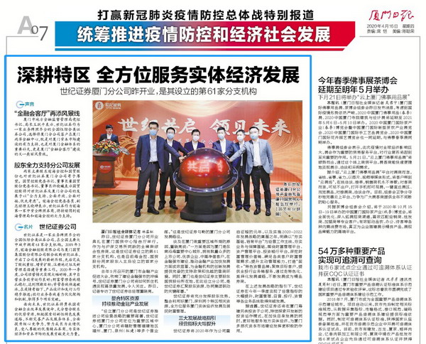 “設立廈門分公司是世紀證券推進(jìn)公司經(jīng)營戰略的重要部署,世紀證券把廈門分公司定位為重要區域中心,廈門分公司將(jiāng)輻射管轄福建地區福州、廈門、泉州(拟建)等多個營業部。”這(zhè)是世紀證券勾勒的廈門分公司發(fā)展路徑。