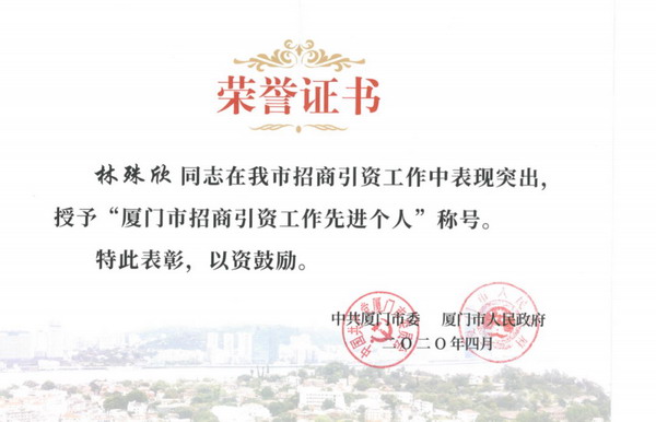 國(guó)貿股份積極響應廈門市委市政府招大引強的号召,主動出擊精準對(duì)接,招優引強力促落地,招商引資成(chéng)果顯著,榮獲“招商引資工作先進(jìn)集體”稱号。