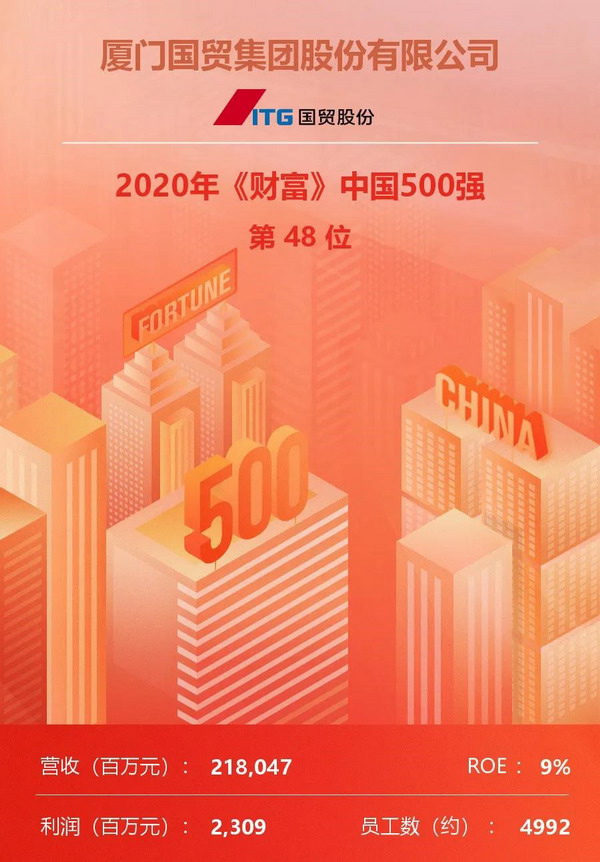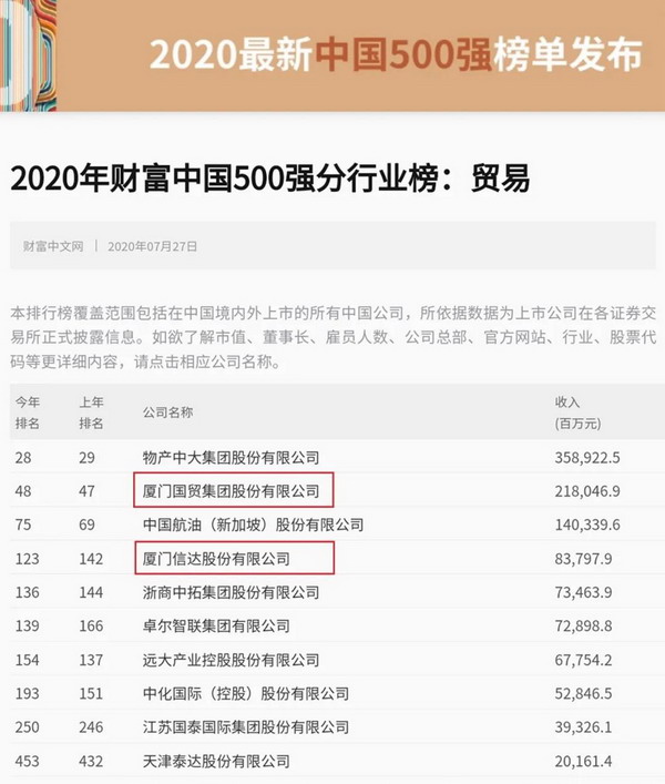 7月27日,财富中文網發(fā)布2020年“中國(guó)500強(上市公司)”排行榜。國(guó)貿控股集團兩(liǎng)家上市公司再度上榜。