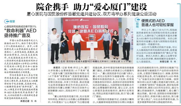 昨日上午,廈門大學(xué)附屬心血管病醫院(以下簡稱“廈心”)黨委與國(guó)貿控股集團旗下廈門國(guó)貿集團股份有限公司(以下簡稱“國(guó)貿股份”)黨委簽署黨建共建協議。雙方就(jiù)拓展和完善黨組織功能(néng)、定期交流經(jīng)驗、共享工作信息、推動黨建與業務深度融合等合作内容達成(chéng)共識。國(guó)貿股份向(xiàng)廈心捐贈了兩(liǎng)台自動體外心髒除顫器(AED),現場還(hái)舉行了心肺複蘇培訓。