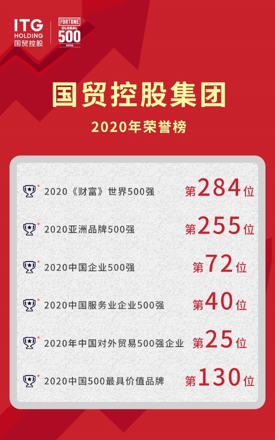 國(guó)貿控股集團位列2020中國(guó)企業500強第72位,上升5位!同時(shí)名列中國(guó)服務業企業500強第40位,上升3位。